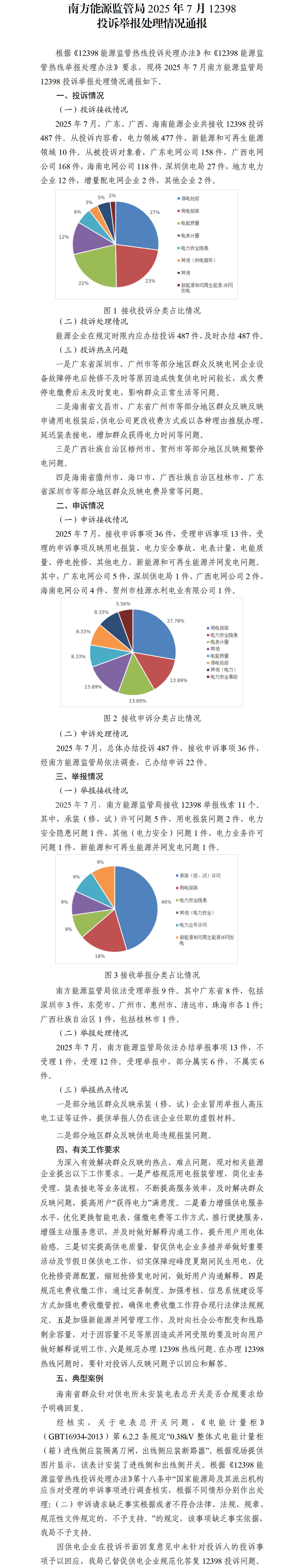 南方能源监管局2025年7月12398投诉举报处理情况通报
